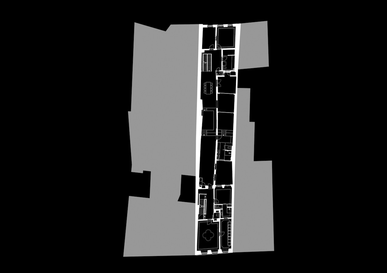 als schmales und langen gesamtprojekt mit zwei gebäuden mit verschiedenen innenhofebenen.