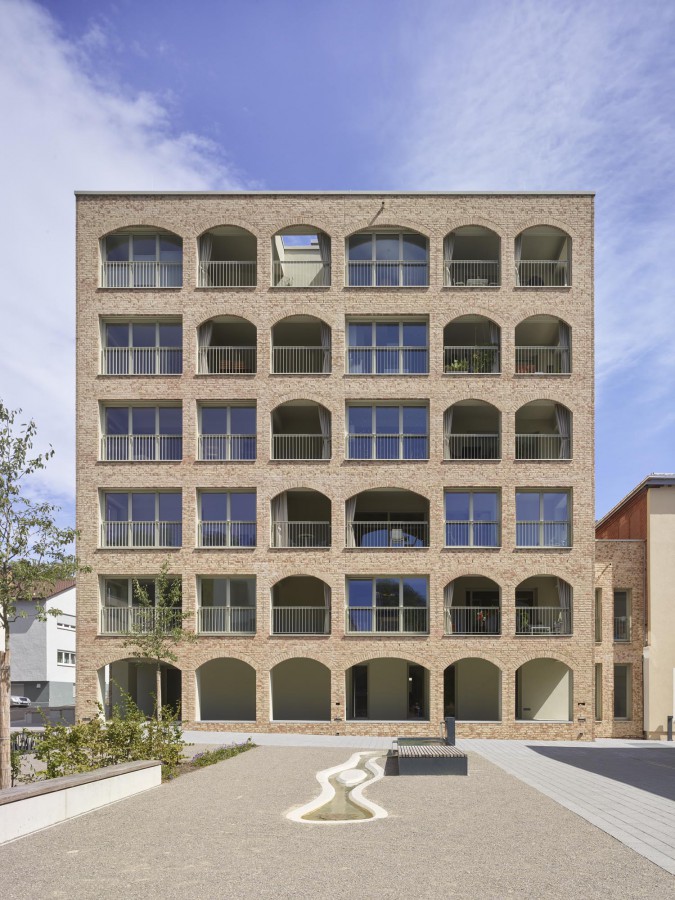 Ein Organismus, der in den Innenräumen und Fassaden die Inhalte von Fabrikatmosphäre weiterträgt und modernes Wohnen Ziegelmural und transparent widerspiegelt.