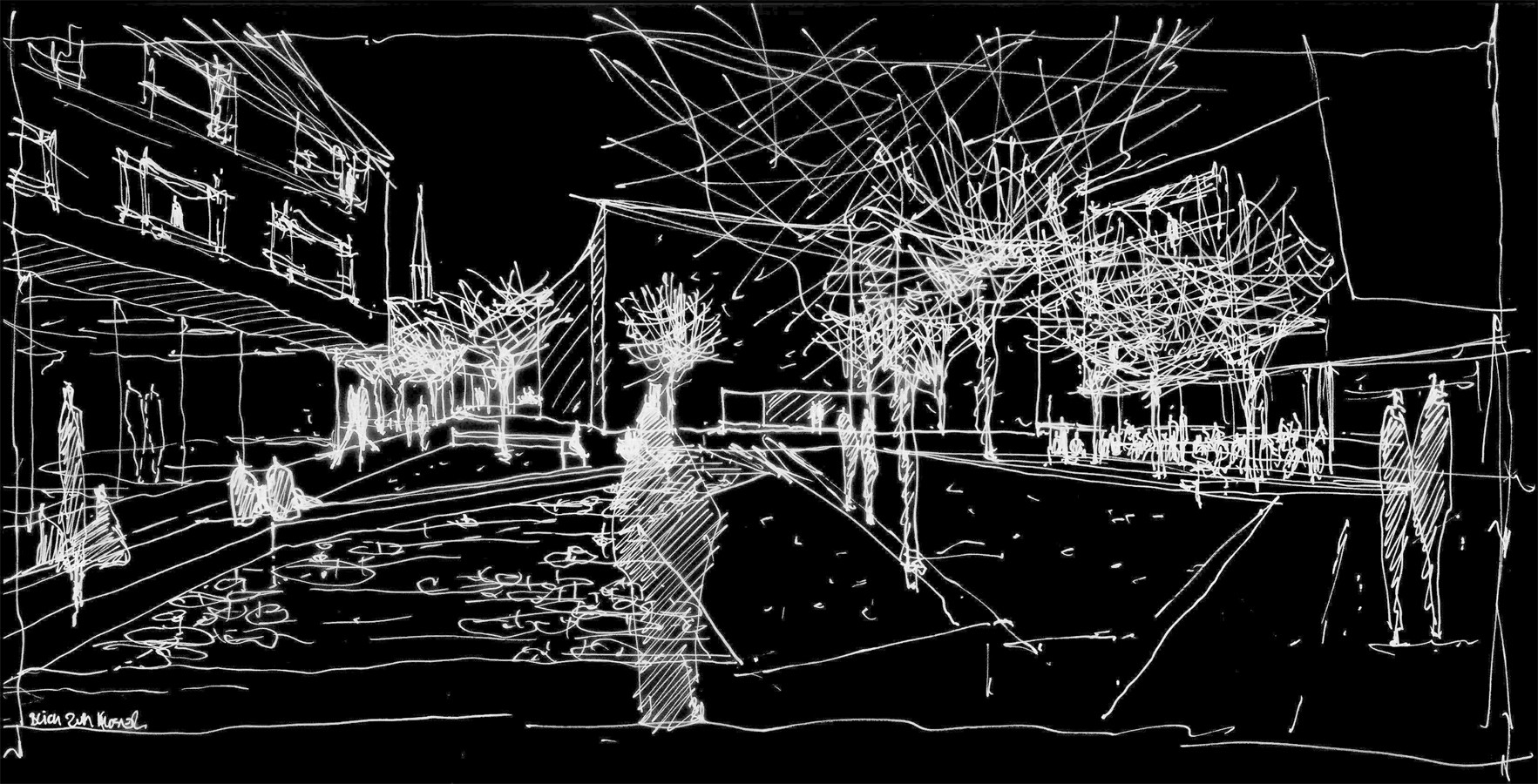 abgeleitet aus der umgebenden städtebaulichen struktur inszenieren die freiflächen im innern den kontrast zur umgebenden steinernen stadt mit einem dichten floral geprägten garten. umspielt von filigranen kirschhainen wechseln in einem leicht fraktalen spiel, befestigte flächen für terrassen, zuwege und stellplätze, mit gärtnerischen themen wie rasen, stauden oder einem kontemplativen wasserspiel, abgeleitet aus dem historischen vorhandenen wasserlauf an dieser stelle, ab und verweben sich zu einem urbanen gartenbild von dezenter farbigkeit.