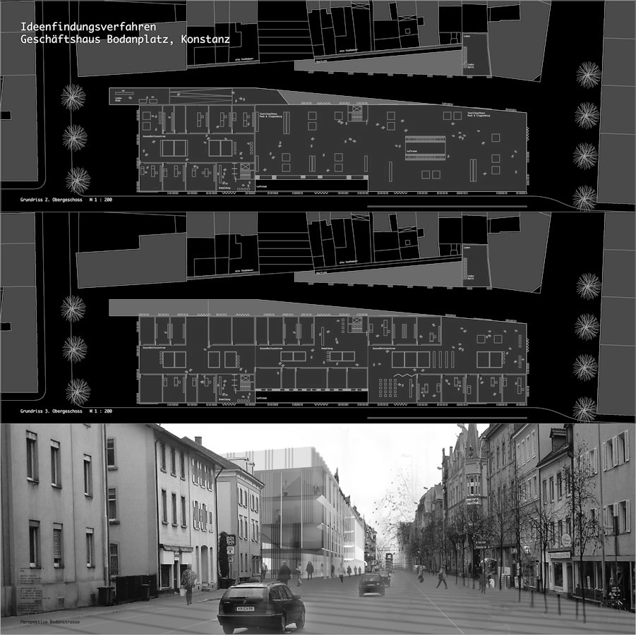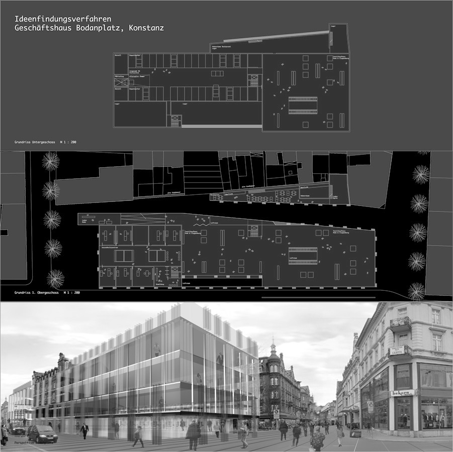 Auf dem Planungsareal entwickelt sich zwischen Bodanplatz, Bodanstrasse, Rosgartenstrasse und Bruderturmgasse eine differenzierte städtebauliche Struktur mit klar formulierten, in Zusammenhang stehenden Plätzen und neuen Wegbeziehungen. Der Bodanplatz als Gesamtsituation wird als grosser stadträumlicher Platz über die Bodanstrasse hinweg entwickelt. Die bestehenden Plätze, Alte Sparkasse, Löwenplatz, bisheriger Bodanplatz werden zusammengefasst und über den Strassenraum bis zur historischen Stadtmauer gelegt. Der neue Platz reicht von der Bruderturmgasse bis zum Bahnhofsplatz und von der Stadtmauer bis zur Wiesenstrasse. Durch die Öffnung und Integration sämtlicher Funktionen auf den Platz und nicht auf eine Strasse, können sich die beiden Innenstadtgefüge Stadelhofen und Neugassenviertel räumlich, gestalterisch und ökonomisch verbinden. Analog historischer Beispiele der Stadtentwicklung, Konzil (Kaufhaus), Markthäuser (Kaufhaus),... stehen auf dem Platz zwei Gebäudeensemble. Zum Einen die bestehende Gebäudeinsel nahe dem Seeuferhaus, zum Anderen das neue Geschäftshaus auf dem Bodanplatz als Möbel, als Platzdifferenzierung und Platzkantenbildung. Das neue Geschäftshaus auf dem Bodanplatz wird als eigenständiges Gesamthaus entwickelt, welches als "Einhaus" erkennbar ist, jedoch auf die unterschiedlichen, wichtigen stadträumlichen Gegebenheiten eingeht und diese in Ihrer Funktion unterstützt. Das Gebäude zeigt sich als im Platzraum offenes Gebäude, in welchem der Platzbelag durch den Innenraum hindurchläuft. Die Fassaden sind als zweischichtiges Netzwerk mit unterschiedlichen vertikalen und horizontalen Gliederungen aufgebaut und integrieren den bestehenden Baukörper optimal. Dem transparenten Gebäude aus verschiedenen Glasarten, wird eine zweite Schicht mit Faltstrukturen aus Kupfermetall und Edelstahl zum Schliessen der Fassaden vorgestellt. Es entsteht ein dynamischen Haus, ein Haus welches verändert werden kann, geöffnet, halbgeöffnet, geschlossen, ein Haus das die Stadtteile entwickelt und verbindet. Nach Süden wird die Fassade analog dem bestehenden Gebäude viergeschossig mit Dachgeschossgeschoss sichtbar. Zur Rosgartenstrasse springt die Fassade im Erdgeschoss zurück und bildet den Haupteingang zum grossen Textilkaufhaus aus. Die historische Stadtmauer wird freigelegt. An dieser entlang wird eine neue Wegebeziehung über den Platz, Geschäftshaus, Rosgartenstrasse, Bruderturmgasse, Neugasse angeboten. Die Höhenentwicklung des neuen Gebäudes reagiert auf die kleinstrukturierte Bebauung um die Stadtmauer und steigert deren Stimmung mit neuen, im Maßstab subtilen Gebäudeelementen. Aus der Erdgeschossebene erweitert sich eine zwei- bis dreigeschossige Ladenzeile als eigenständige Geschäftseinheit oder im Textilhaus integriert. Dieser Baukörper kragt in Richtung Bruderturmgasse aus und bildet den städtebaulichen Abschluss an der Westseite. Als in den Platz hineinragendes Bauwerk, analog den bestehenden Gebäude, Rotes Haus und Sporthaus Gruner wird hier ein Triptychon gebildet. Es entsteht eine neue Platzgasse mit einer Verlängerung der Fassadenkante des Schuhhaus König, mit neuen Ladengeschäften und einem Restaurant, in welchen die Stadtmauer in der Gesamthöhe sichtbar bleibt. Über ein bestehendes Gebäude in der Neugasse wird der neue Stadtraum ebenfalls erschlossen und verbindet sich mit diesem am neuen Restaurant. Durch die Gesamtkonzeption und die Fassadengestaltung mit hochwertigen und veredelten Materialien, wird ein Gebäude mit grosser Wertigkeit vorgeschlagen. Das geforderte Raumprogramm mit grossem Textilhaus, Kleinläden und Gesundheitszentrum wird komplett erfüllt und durch zwei zentrale Erschliessungen optimal erschlossen.