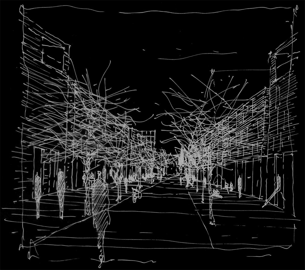 das neue wohnquartier wird konsequent in das bestehende stadtquartier döbele integriert. die angrenzenden fassaden der gründerzeitbebauungen bilden einen guten rahmen für die schaffung von hochwertigen verkehrsberuhigten bereichen zwischen den bestehenden gebäuden und den neuen gebäudeblöcken. der boulevard wird mit breiten geh und nutzflächen kurzzeitparkmöglichkeiten links und rechts auch für anlieferungen und dem straßenraum grosszügig gestaltet. es soll ein lebendiger grüner mit bäumen gesäumter boulevard entstehen. alle weiteren straßen werden als anliegerstraßen angeboten. es entstehen der wertigkeit entsprechend vier tiefgaragenzufahrten zwei in den anliegerstraßen ausschließlich für anlieger zwei an der grenzbachstraße für öffentliche nutzungen und anlieger. an der döbelestraße entsteht ein quartierstreffpunkt/kiosk etc. und bewirtung auf den platz und in die grünräume hinein. in der verlängerung döbelestraße/schützenstrasse ist es notwendig auch die angrenzenden straßenund platzräume in das verkehrsberuhigte quartierskonzept mit einzubinden. selbstverständlich können anlieger, busse, sowie fußgänger und radfahrer die flächen nutzen. innerhalb der neuen bebauungen entstehen grüne innenräume. passagen bilden verbindungsmöglichkeiten innerhalb des quartiers nach ost und west. eine passage nach norden ist die direkte verbindung zur döbelestraße. die passagen haben direkte anbindungen an die grünverbindungen am grenzbach. die aufnahme des themas wasser, regenwasser ist ein wichtiges freiraumplanerisches element.
