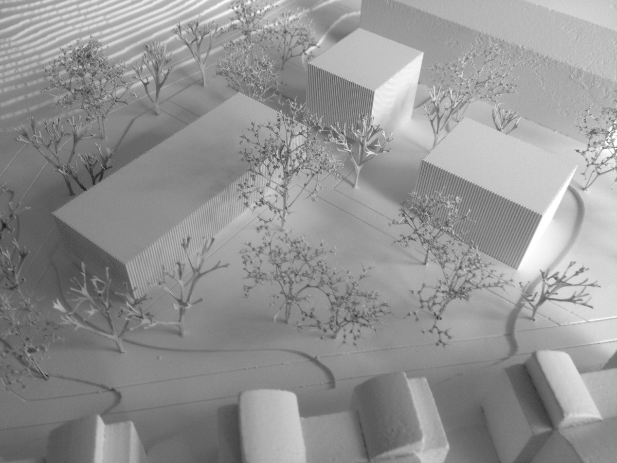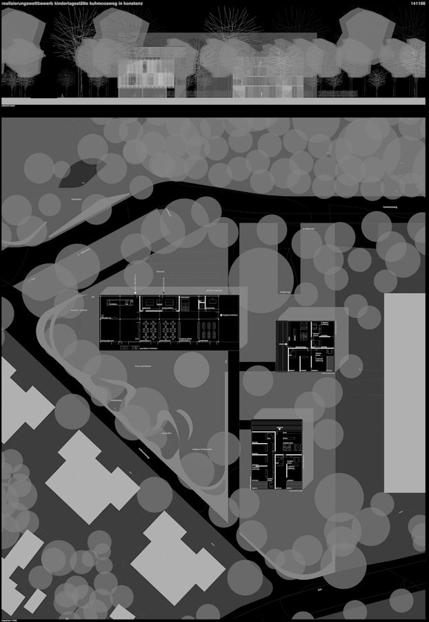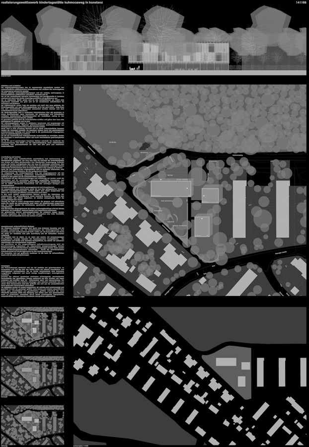 die umgebungsbebauungen des zu beplanenden grundstücks werden von unterschiedlichen städtebaulichen baustrukturen und ansätzen des wohnungsbaus der vergangenen jahrzehnte geprägt. parallel gestellte wohnungsstrukturstangen und die ansätze, wohnungsbau in kleinmaßstäbliche gebäudeteile aufzulösen, wechseln sich ab. der ort der neubebauung zwischen kuhmoosweg und danzigerstraße in konstanz zeichnet sich durch eine große, inselartige parkfläche mit großbäumen aus. die zu bebauende fläche grenzt sich zu den nachbarflächen ab, bietet eine angenehme massivität von grün und ist ein wunderbarer aufenthaltsort für menschen und kleintiere. der städtebauliche ansatz folgt der parkidee und stellt drei neue gebäude, die kindertagesstätte und zwei wohnungsgebäude, so in den park hinein, dass diese von den vorhandenen baumriesen ummantelt werden können und sich zurückhaltend dezent präsentieren. die kindertagesstätte wird in modularem holzrahmenbau über alle geschosse in einem durchlaufenden raster konstruiert, mit verglasungen und umlaufenden vertikalen holzstrukturen (schiebeelemente) mit rundstäben, analog zu den vorherrschenden baumstrukturen, umhüllt. im gesamten gebäude sind die holzmaterialien sichtbar und geben dem haus eine geborgenheit im gebäude und im park. die wohnungsgebäude werden in stahlbeton konstruiert, mit verglasungen mit umlaufenden vertikalen, filigranen gitterroststrukturen (schiebeelemente) aus ökologischem recyclingaluminium bronze eloxiert umhüllt. durch zwei in ihrer anmutung ähnliche und im detail unterschiedliche fassaden werden die nutzungen lesbar, die baukörper bleiben durch ihre geschosshohen schiebeelemente vielfältig und werden sich in die parklandschaft eingruppieren, ohne an selbstständigkeit zu verlieren. um die der baumlandschaft widersprechende horizontalität zu vermeiden, werden die baukörper in verschiedenen höhen und somit verschiedenen geschossigkeiten entworfen. die III, IV und V geschossigen bausteine bleiben unterhalb der traufkante der nachbarbebauung und bilden aus der höhenentwicklung einen städebaulichen abschluss, vom geschosswohnen der 50er und 60er jahre zum westlichen landschaftsraum.