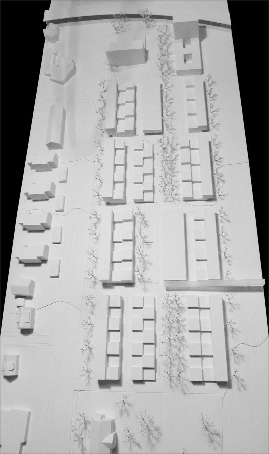 zur bahntrasse wird das system der raumbildung des quartiers ebenfalls vorgeschlagen, jedoch mit einer geschossigkeit von drei bis eingeschossigen wohnformen.