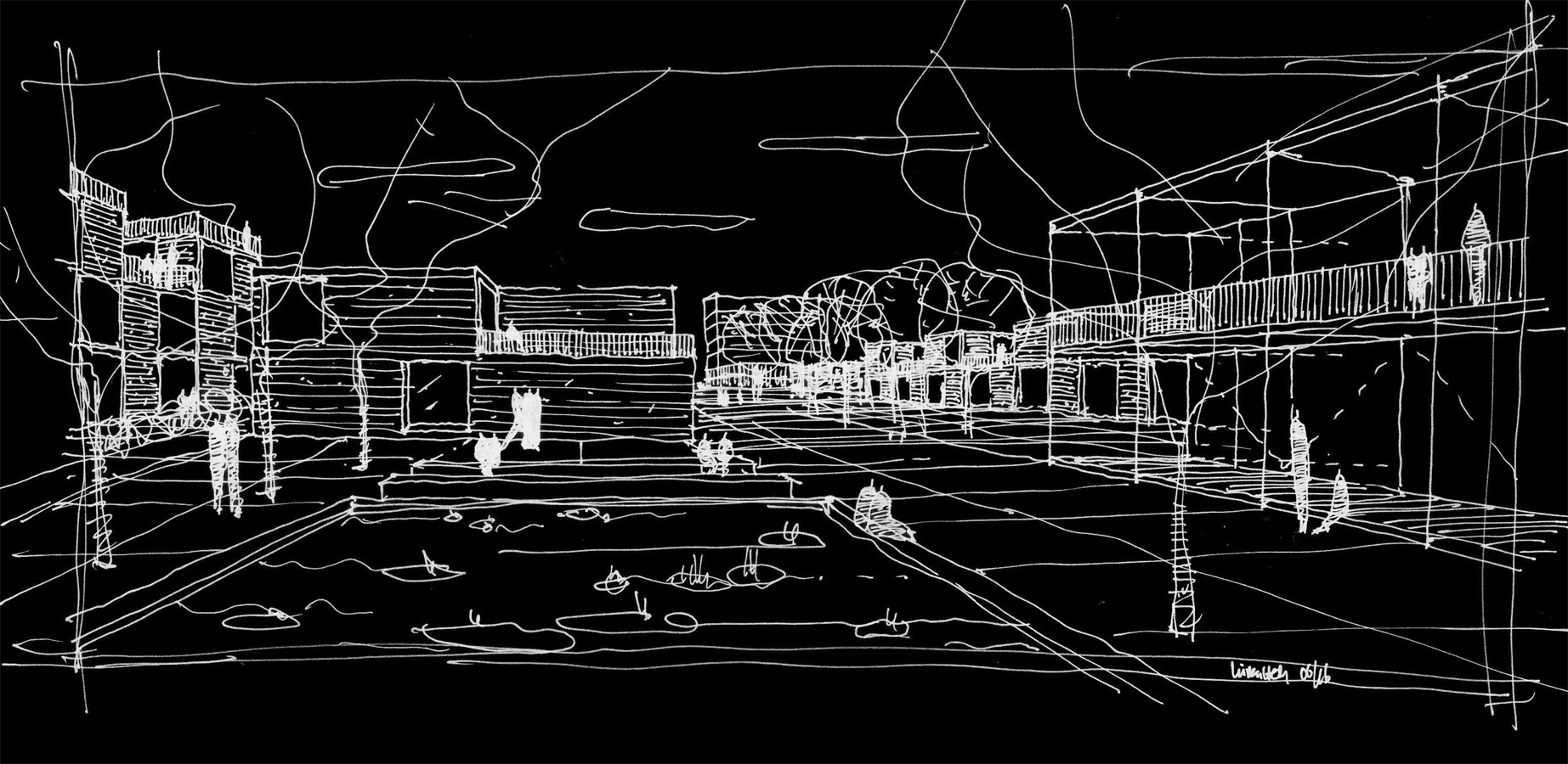 zwei schmale wasserläufe im westen und osten führen die wasserflächen in die beiden zentralen öffentlichen plätze, mit jeweils einem wasserbecken, hinein.