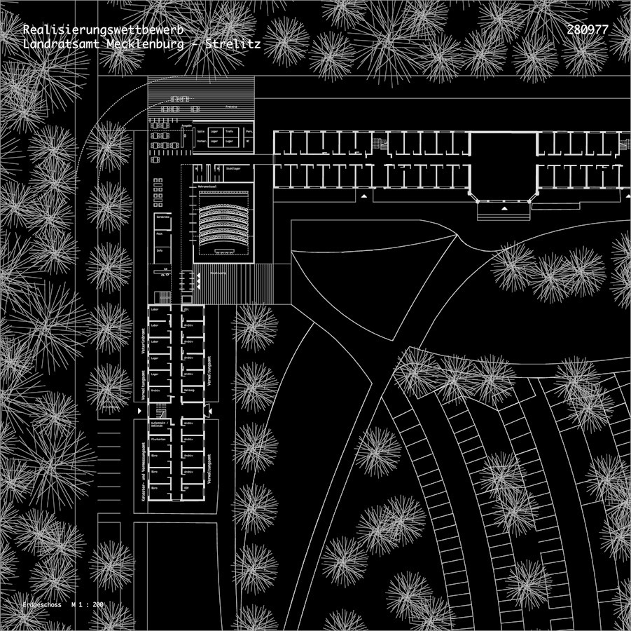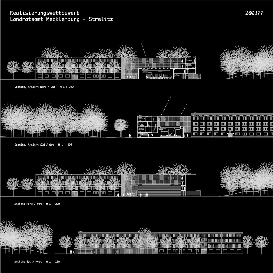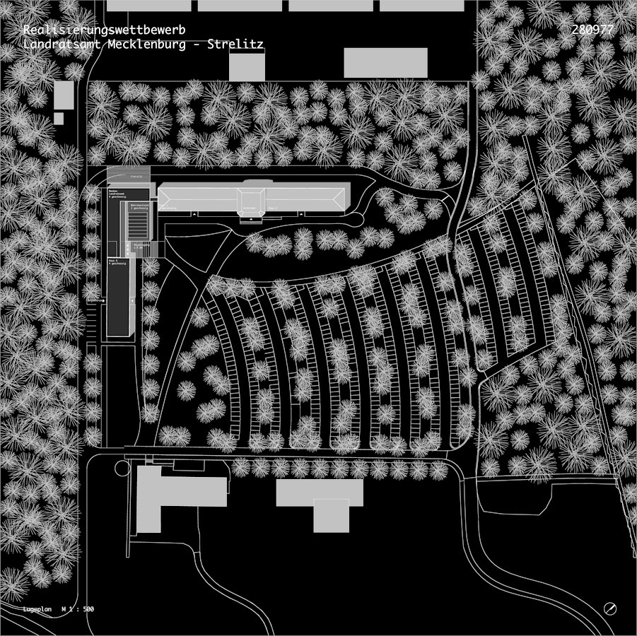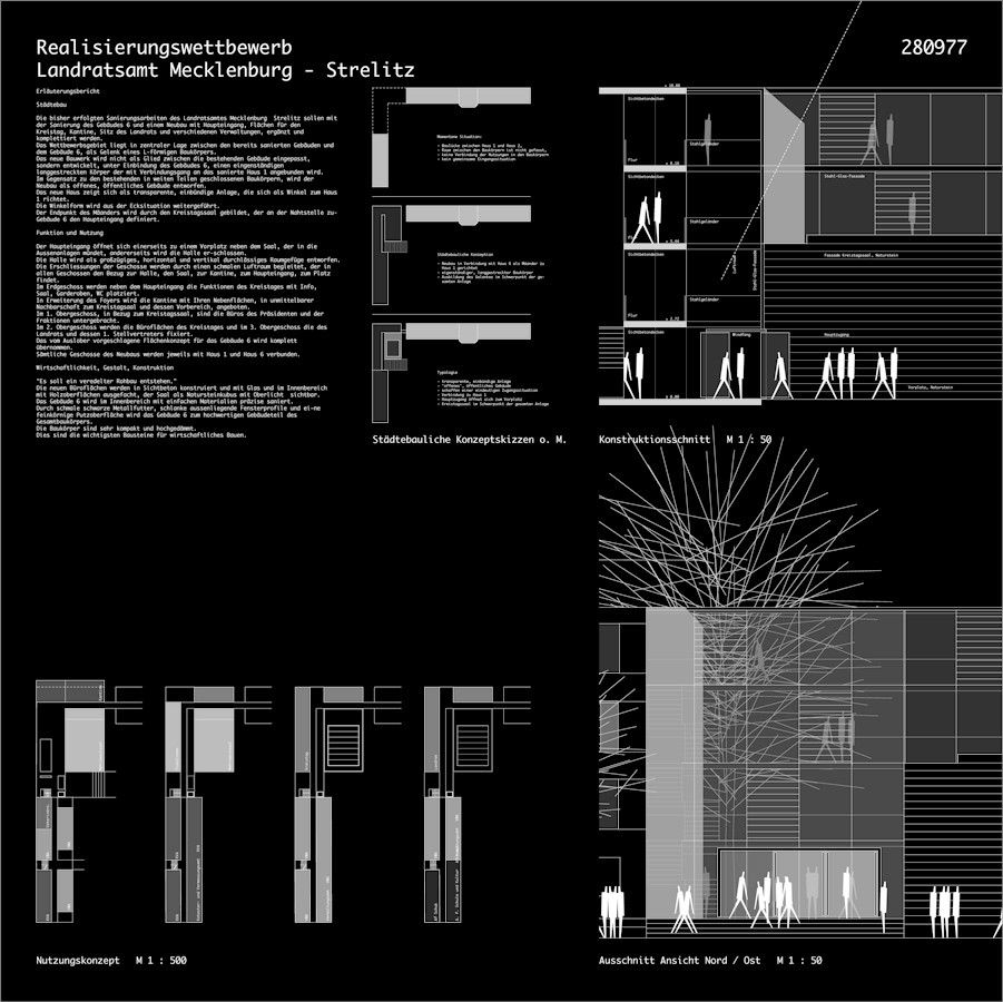 Die bisher erfolgten Sanierungsarbeiten des Landratsamtes Mecklenburg Strelitz sollen mit der Sanierung des Gebäudes 6 und einem Neubau mit Haupteingang, Flächen für den Kreistag, Kantine, Sitz des Landrats und verschiedenen Verwaltungen, ergänzt und komplettiert werden.Das Wettbewerbsgebiet liegt in zentraler Lage zwischen den bereits sanierten Gebäuden und dem Gebäude 6, als Gelenk eines L-förmigen Baukörpers.Das neue Bauwerk wird nicht als Glied zwischen die bestehenden Gebäude eingepasst, sondern entwickelt, unter Einbindung des Gebäudes 6, einen eingenständigen langgestreckten Körper der mit Verbindungsgang an das sanierte Haus 1 angebunden wird.Im Gegensatz zu den bestehenden in weiten Teilen geschlossenen Baukörpern, wird der Neubau als offenes, öffentliches Gebäude entworfen.Das neue Haus zeigt sich als transparente, einbündige Anlage, die sich als Winkel zum Haus 1 richtet.Die Winkelform wird aus der Ecksituation weitergeführt.Der Endpunkt des Mäanders wird durch den Kreistagssaal gebildet, der an der Nahtstelle zu- Gebäude 6 den Haupteingang definiert.