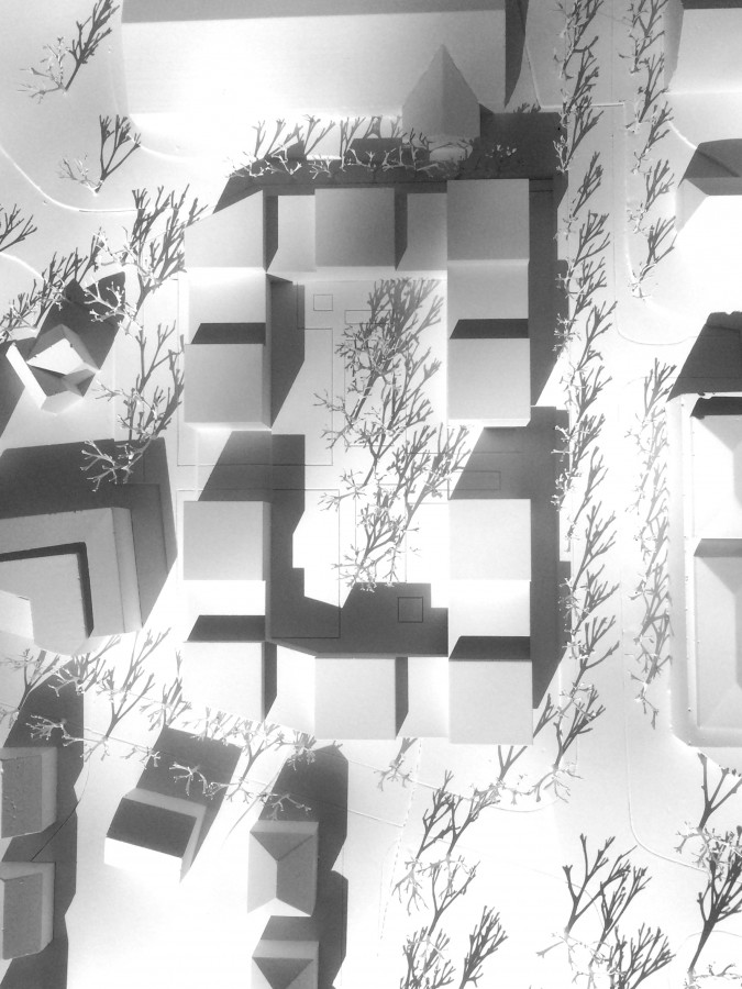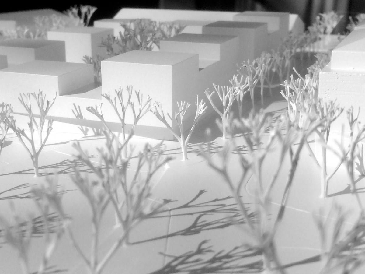 die qualität des baugrundstücks wird durch die räumliche nähe zur innenstadt, der parkfläche mit großbäumen im süden, sowie die grosszügig gestaltete und durchgrünte fläche der öffentlichen gebäude hallenbad und schulen geprägt. das grundstück stößt an verschiedene, heterogene bebauungsstrukturen an, an die blockrandbebauungen der einzelwohnhäuser, an das gewerbegebiet und die einfahrtsstraße zur innenstadt mit auch größeren gebäuden entlang der ziegelstraße. aus dem maßstab der angrenzenden wohnhäuser und deren siedlungsstruktur heraus wird ein städtebaulicher ansatz entwickelt, der aus einzelhäusern und notwendigen blockrandbebauungen seine inhalte findet. es wird eine orthogonale baustruktur mit zehn punkthäusern entwickelt, welche an der ziegelstraße, der friedrich-schiller-straße und am nördlichen bebauungsrand mit dazwischengestellten in der höhe abgesetzten gebäuden geschlossen wird. es entsteht ein blockrand, an den beiden straßen mit anschluß zum gebäude des siedlungswerk, sowie den gebäudes an der ziegelstraße und auch entlang der nördlichen grenze mit dem übergang zu den beiden weiteren vorhandenen gebäuden im westen des grundstücks. die ankommenden richtungen der bestehenden gebäude werden in die neue baustruktur aufgenommen und in diese hineingeführt, so entsteht ein logischer blockrand mit subtiler integration der bestandsbebauung. um das neue bauwerk auf den südlichen platz zu präzisieren wird die südfassade rechtwinklig zum platz vorgeschlagen, dies ergibt ein präzisere kante zur grünfläche und die möglichkeit bestehende ahornbäume auf dem grundstück stehen zu lassen, die eine vernetzung mit dem park erlauben.