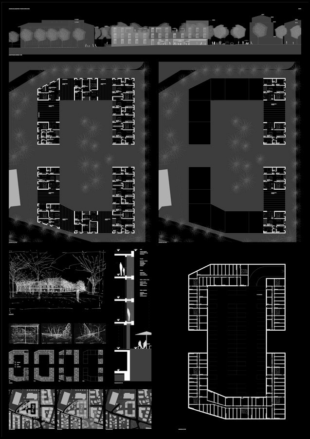 die erschließung der gebäude wird von den umlaufenden äußeren gebäuderändern erfolgen, sodass ein ruhiger durchgrünter innenhof mit unterschiedlichen privaten und gemeinsamen flächen entsteht. an der ziegelstraße und in teilbereichen der kreuzung an der friedrich-schillerstraße werden im erdgeschoss kleinere ladenflächen, ein cafe und pflegeeinrichtungen vorgeschlagen, weitere dienstleistungen, ärzte oder büros sind im erdgeschoss an der friedrich-schiller-straße und teilweise im 1. obergeschoss an der ziegelstraße vorgesehen. im nordbereich der wohnanlage werden in den hauptgeschossen büroflächen z.b. für das institut dhbw vorgeschlagen, alternativ könnten hier auch studentenwohnungen geplant werden. an der nordwestlichen seite werden studentenwohnungen / kleine wohneinheiten mit laubengangerschließung vorgeschlagen. alle sonstigen flächen sind dem wohnen vorbehalten. durch das angebot von unterschiedichen wohnungen können unterschiedliche wohnmodelle, einzelwohnungen, seniorenwohnen oder wohnen in gemeinschaften für die bewohner entstehen.
