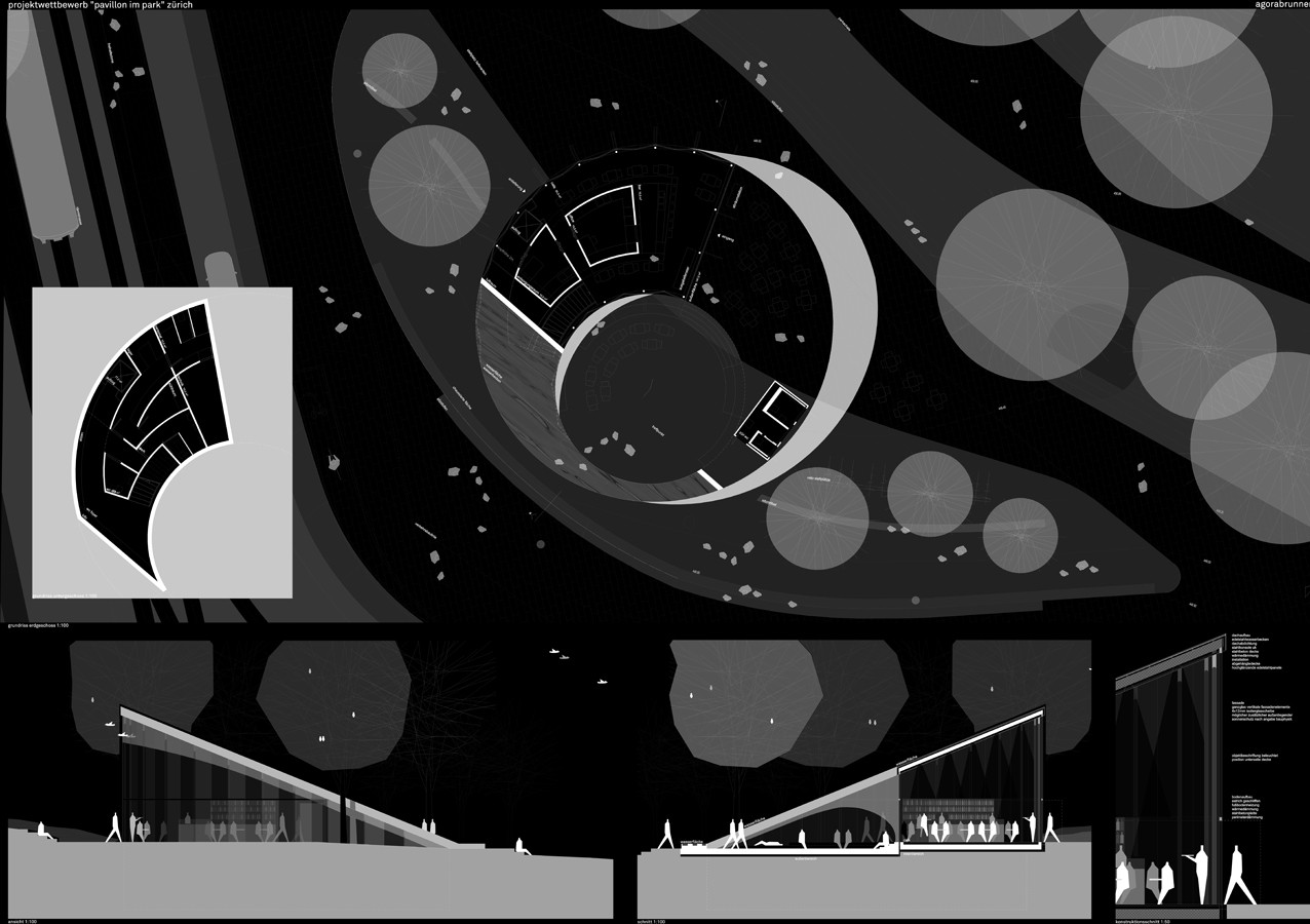 das grundstück des «pavillon im park» liegt stadträumlich präsent an der südspitze am park des universitätsspitals zürich, direkt an der straßenverbindung rämistraße/gloriastraße im zentrum von zürich. die gesamtsituation zeichnet sich durch die räumliche nähe zum universitätsspital zürich und der eidgenössischen technischen hochschule zürich aus. durch den neuen pavillon im park soll ein urbaner treffpunkt für die öffentlichkeit und die drei institutionen entstehen. auf der planerisch vorgegebenen parkschale wird eine kreisrunde, zur straßenkreuzung und zur stadt zürich ausgerichtete, geneigte und geknickte dachfläche mit kreisrundem ausschnitt als «agora» vorgeschlagen. die topografie, die neigung des parks und der übergang zum straßenraum wird in der dachfläche abgebildet, sodass eine öffnung zum park und eine verortung zur stadt entsteht. in remineszenz zu historischen parkanlagen und deren ausbildung von brunnenbauwerken am südlichen abschluss, wie zum beispiel beim benachbarten rechberggarten, wird der neue pavillon, der «agorabrunnen» vorgeschlagen. die zum straßenraum sichtbare gesamtkreisringfläche wird an der obersten ringfläche mit sanften wasseraustrittsdüsen so versehen, dass eine leicht fließende, ca 5cm tiefe, wasserfläche entsteht, die im genickten flachbereich wieder abgeführt wird. es entsteht eine geknickte wasserfläche, ein spiegel, je nach tages- und jahreszeit different, hell und dunkel, blaugrün, schwarz und weiß, matt und glänzend, eine bewegte metapherfläche des lebens. über stufen im sehr flachen wassser wird die agorabrunnenfläche begangen und die öffnung zum park spürbar. umgekehrt öffnet sich der pavillon aus dem park kommend und es entsteht ein fokus zur stadt. hier ist die mitte des bauwerks und der treffpunkt zum verweilen mit gastwirtschaft, bar und öffenbaren glasfassaden zu drei seiten, dies mit überdeckten außensitzplätzen und sitzstufen. die fassadenflächen der gastronomie sind hochtransparent mit schmalsten profilen konstruiert. die nicht transparenten nebenräume sind in einem untergeschoss, über aufzug und der fassadengeometrie folgenden treppe erreichbar, zusammengefasst. dem konzept der wasserfläche auf dem dach folgend wird die dachscheibenuntersicht mit hochglänzenden edelstahlpanelen belegt. hierdurch entsteht eine gesamtskulptur mit umlaufend reflektierender oberfläche und eine dachuntersicht als kreisring, welche unterschiedlichste, aus dem pavillon und den überdachungen spiegelnde perspektiven in den park, die umgebung, zu anderen und zu sich selbst ermöglicht. die tragkonstruktion der räumlichen dachscheibe wird in stahlbeton vorgeschlagen, welche über filigrane stützen im gastronomiebereich und dem vorgegeben baukörper des züri wc, auch als aussteifung, in die fundamente abgetragen wird. mit dem vorgeschlagenen konzept wird eine präzise idee für dieses projekt an diesem ort formuliert. durch eine sorgfältige, dem entwurfsansatz exakt nachfolgende realisierung, entsteht ein neues, den inhalten angemessenes, unverwechselbares bauwerkskonzept für den bauherr, die besucher und die stadt zürich.