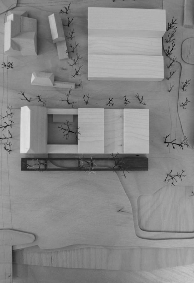 die erweiterungsflächen für die schule können je nach den bedürfnissen unterschiedlich angeordnet werden: im erdgeschoss mit zugangsmöglichkeit über den pausenhof eine mensa, im obergeschoss über dem vereinraum in leichtbauweise klassenräume und / oder räume für die ganztagesbetreuung. alternativ kann auch im bestehenden gebäude im erdgeschoss die mensa angeordnet werden und im obergeschoss vier neue klassenräume. der jugendraum wird als ein in die vorgelagerte pergola integriertes, auskragendes bauwerk in holzleichtbauweise, dem landschaftsraum zugewandt, vorgeschlagen. er wird somit seiner speziellen nutzung bezüglich lage und ausgestaltung gerecht. der einkaufsmarkt kann sämtliche anforderungen an einen funktionalen nahversorgermarkt erfüllen: kurze wege von den parkplätzen, übersichtlicher eingangsbereich, günstiger grundrisszuschnitt, gute andienung, dies unter berücksichtigung einer guten gestalterischen einbindung in die umgebung. sämtliche neue wohnungen profitieren von den neu artikulierten freiräumen mit den allgegenwärtigen schönen bezügen zur sonne, zum fluss wiese und zur kernstadt. grundbaustein innerhalb der beiden gebäudeteile für die wohnnutzung ist ein übersichtliches und wirtschaftliches erschließungssystem. ein am treppenhaus angeliedeter durchgehender begrünter lichtfuge ergibt spannende raum- und belichtungseindrücke. auf den jeweiligen geschossen sind jeweils nach bedarf von 6 bis zu 7 wohnungen möglich, die wohnräume sind mit hochwertigen, geschützten aussenbereichen ausgestattet nach südwesten zum landschaftsraum orientiert. fassaden, materialien die neuen gebäude erhalten eine aus dem kontext begründete, angelehnte materialität, differenziert eingesetzt lassen sich mit dem fassadenmaterial sichtbeton den jeweiligen randbedingungen angepasst individuelle qualitäten erzeugen: die einzelnen bausteine sollen in untereinander leicht differenzierten farbgebungen ausgeführt werden. die wohnbebauung und der einkaufsmarkt werden in einer den bestehenden benachbarten wohngebäuden angepassten gräulichen farbigkeit vorgeschlagen, das gebäude an der schule mit einer aus dem natursteingesimsen der bestehenden schule abgeleiteten beige bräunlichen farbigkeit. Die fassade des einkaufmarktes an den stirnseiten und nach süden zum erschließungsgang soll eine feine perforierung erhalten um die flächen in ihrer massivität zu brechen und sowohl von innen nach aussen sowie aussen nach innen interessante lichteindrücke zu erzeugen. die neuen gebäude sollen sich aus der kontinuität abgeleitet einfügen, ohne auf eine eigene selbstbewusste, klare ausdrucksweise zu verzichten. die einzelnen gebäude sind ablesbar und bilden dennoch eine hoch identität stiftende neue gebäudegruppe. somit präsentiert sich das gesamte ensemble mit den zwei eigenständigen gebäudeformen, fein miteinander korrespondierend, als zeitgemäßes, hochwertiges quartier für öffentliche einrichtungen und zeitgemäßes wohnen am landschaftsraum wiese.