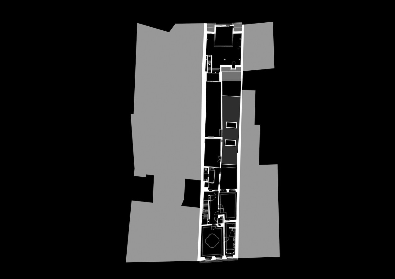 als schmales und langen gesamtprojekt mit zwei gebäuden mit verschiedenen innenhofebenen.