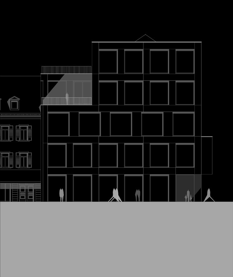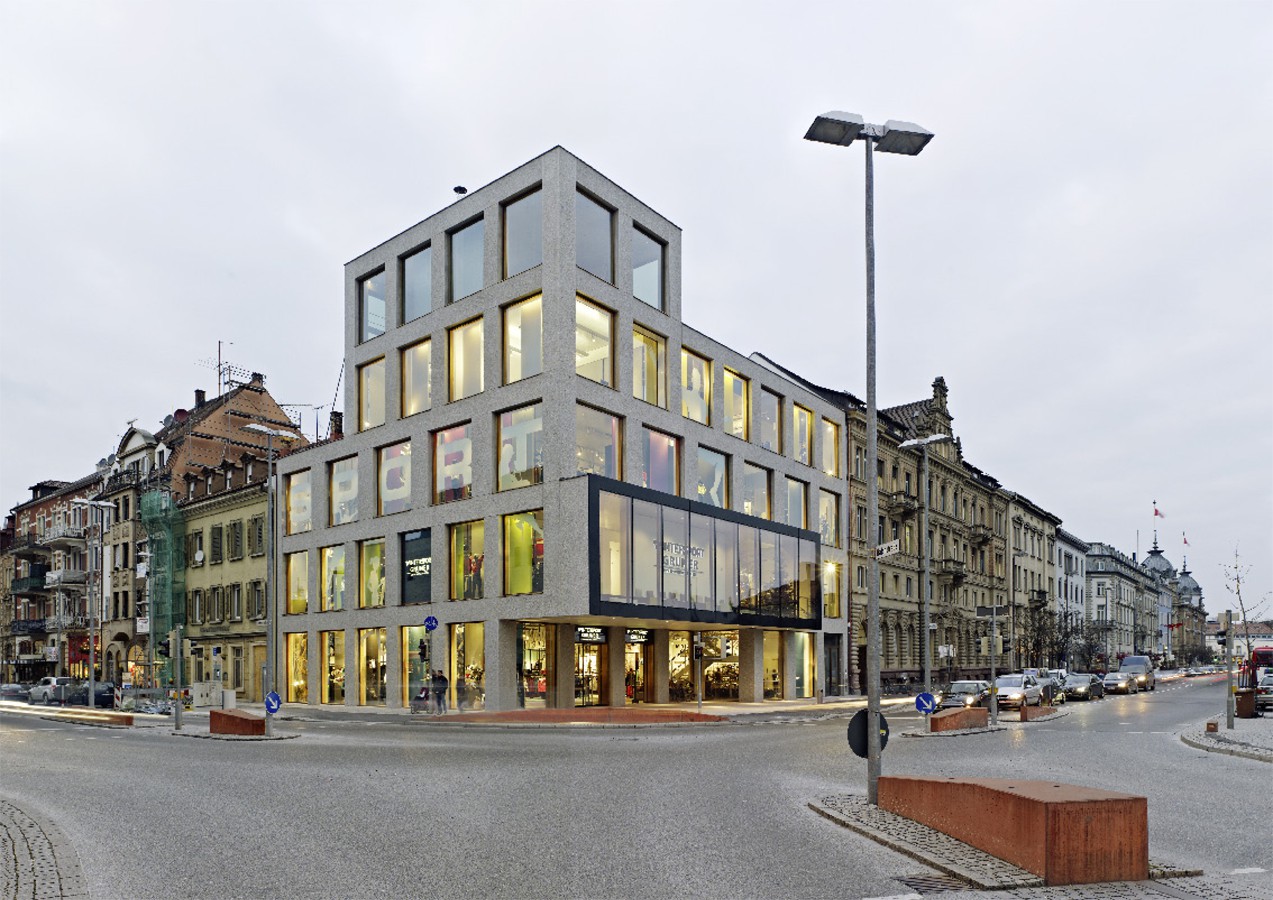 bezugnehmend auf die unterschiedlichen stadträumlichen gegebenheiten und die neuen städtebaulichen und gestalterischen funktionen, wurde in diesem verhältnis und proportionen – wandanteil zu glas – die baukörperfigur, eine große skulptur, ein gesamtvolumen, aus welchem einzelvolumen heraus- und hinzugenommen wurden, entwickelt. trauf- und firstlinien der nachbargebäude werden im bauwerk aufgenommen und weitergeführt. analog dem ehemaligen postgebäude, der heutigen sparkasse bodensee, mit der eckbetonung als turm, die den abschluss des bahnhofsplatzes markiert, wird der neue baukörper des sporthauses an der ecke zur bodanstraße erhöht und bildet nun einen markanten städtischen abschluss des bahnhofsplatzes. aus dem eingang heraus entwickelt sich die stadtloggia, ein großes, offenes volumen, ein erker, der aus der sonstigen gebäudegestaltung heraustritt und die räume, das innere des bauwerks, der skulptur, zum stadtraum, zum boulevard, zum see öffnet. die aussen- und innenwände sind in sichtbeton mit unterschiedlichen oberflächen ausgeführt. der beton der aussenfassade wurde mit ausgesuchten zuschlagsstoffen d.h. mit schwarzen, grünen, braunen und beigen steinen vermischt und die oberfläche steinmetzmäßig gestockt und schariert, so dass eine bewegte, weiche oberfläche mit graubrauner farbe entsteht. die profile der verglasungen und türen wurden in baubronze ausgeführt als reminiszenz an die häuser der jahrhundertwende. an der aussenkante zum innenraum wechselt der beton zum glatten grauen sichtbeton, der in den innenraum, an den wänden, böden und decken fortgeführt wird. die deckenflächen wurden zusätzlich silber lackiert, was den innenräumen einen zusätzlichen glanz verleiht und lichtreflexe von aussen nach innen und innen nach aussen zuläßt. im inneraum entwickeln sich sieben gestapelte geschosse, fünf verkaufsgeschosse, ein geschoss für ausstellung und verwaltung und ein wohngeschoss, meist fast quadratische räume mit stattlicher raumhöhe, ohne abgehängte decken oder verkleidungen, mit sichtbarer betontragkonstruktion der aussenwände und vier stützen im zentralbereich. zur aussenfassade bahnhofsplatz orientiert, entwickelt sich die freitragende treppe über die geschosse mit ihren lufträumen, zeigt im innenraum die gesamthöhe, verbindet, gibt einblicke in die geschosse und ausblicke in die urbane stadt. das entwickelte gefüge und die architektur des sporthauses zum see gibt dem bahnhofsplatz in konstanz einen südlichen, städtbaulichen abschluß des boulevards. durch die massivität der großflächigen wandflächen und der transparenz der glasfassaden entsteht ein kontrast aus stabilität und dynamik und die notwendige beziehung zu den historischen nachbargebäuden.