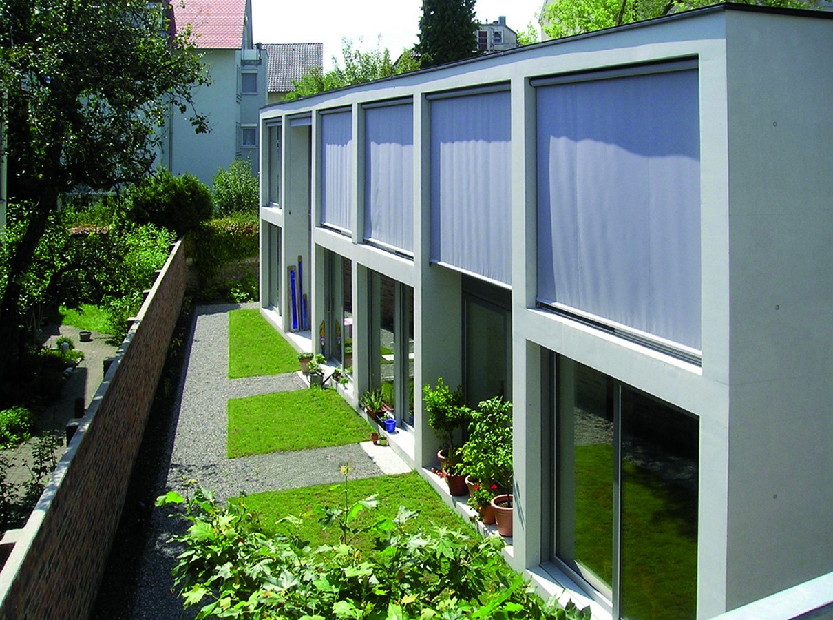 die vorhandene mittelalterliche geschlossene bebauung mit hofhäusern für handwerker und wohnen in der hüetlinstraße in konstanz wird durch einen zusätzlichen baustein, eine neues hofhaus ergänzt. die schmale grundstücksfläche wird einerseits mit neuen klinkermauern andererseits durch das neue zweigeschossige sichtbetonhaus geschlossen sodass eine private innenhoffläche mit wohnqualität entsteht. das neue gebäude mit zwei wohneinheiten untersteht einem geordneten rhythmus in konstruktion - sichtbeton und ausbau - putz/holz/glas welcher sich ebenfalls konsequent in den verglasungen und aussenbezügen wiederspiegelt.