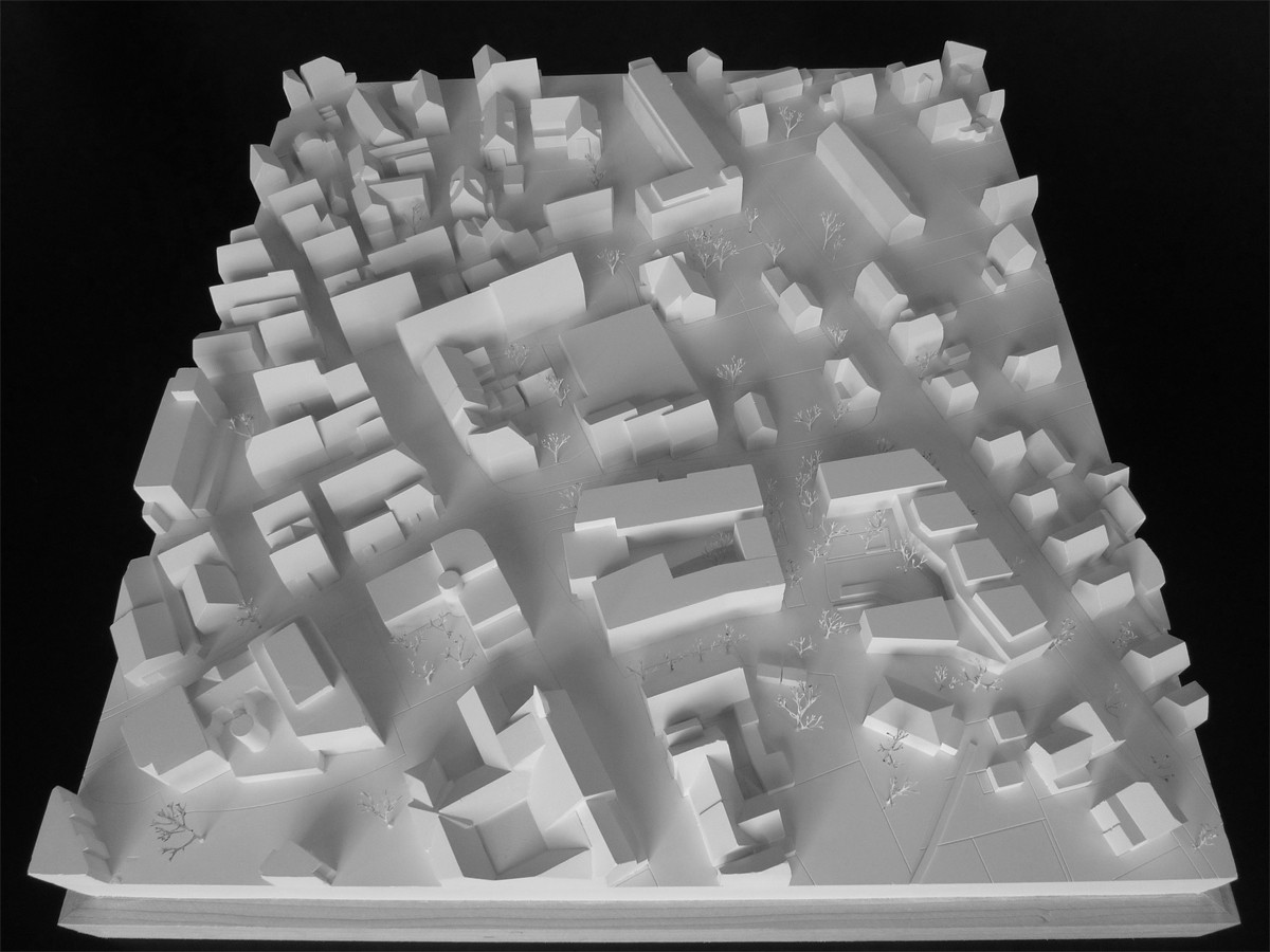 abgeleitet aus der umgebenden städtebaulichen struktur inszenieren die freiflächen im innern den kontrast zur umgebenden steinernen stadt mit einem dichten floral geprägten garten. umspielt von filigranen kirschhainen wechseln in einem leicht fraktalen spiel, befestigte flächen für terrassen, zuwege und stellplätze, mit gärtnerischen themen wie rasen, stauden oder einem kontemplativen wasserspiel, abgeleitet aus dem historischen vorhandenen wasserlauf an dieser stelle, ab und verweben sich zu einem urbanen gartenbild von dezenter farbigkeit.