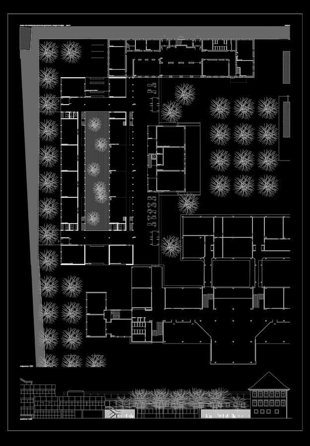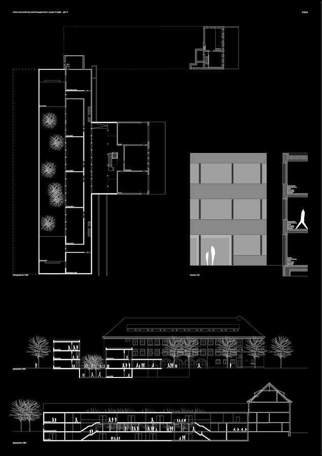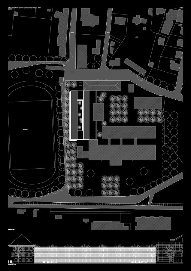 die zentrale halle wird vom schulhof, als auch vom stadionweg erschlossen. die eingeschossige halle wird zum verbindenden element zwischen den verschiedenen schulen und für die benutzer. im historischen schulgebäude wird der pausenraum aufgelöst und als verbindender raum zur halle geöffnet. dieser pausenraum, kombiniert mit einem weiteren pausenraum und zwei klassenräumen werden zwischen halle und neuem innenhof eingefügt und lassen sich zu den verschiedenen veranstaltungen öffnen. auf einen zentralen luftraum über die geschosse hinweg wird bewusst zum vorteil der großen erdgeschossfläche verzichtet, es werden differenzierte lufträume in angemessenheit zu den funktionen angeboten