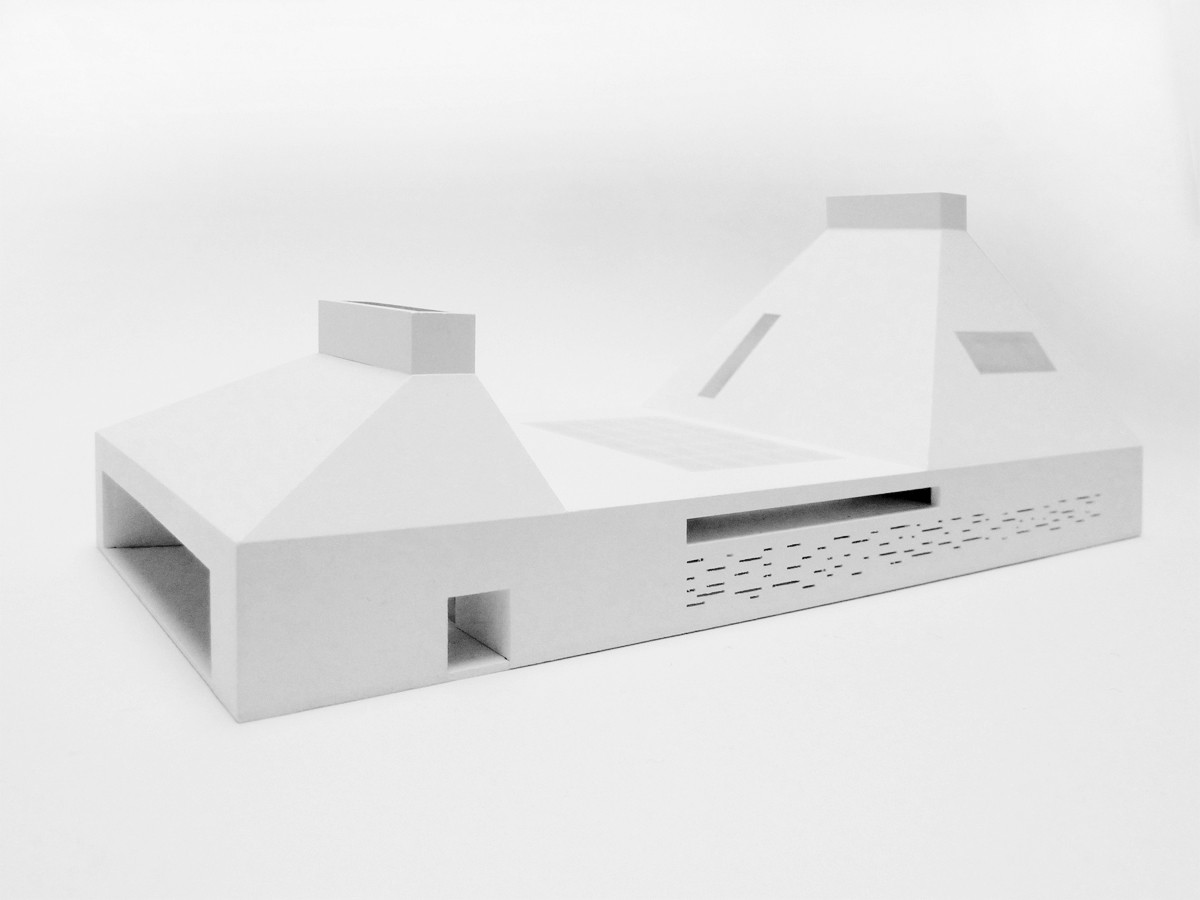 Das Gebäude soll in wirtschaftlicher Stahlbetonmassivbauweise mit einer hoch gedämmten Vorsatzschale mit an Dach und Wand weiß glasierten Dachziegeln entstehen. Die Dächer und Decken im Innenraum und im Vorbereich sollen weiß ausgeführt werden, Wandbekleidungen bis auf ca. 2,10 m und der Fussboden in hellem Eichenholz.