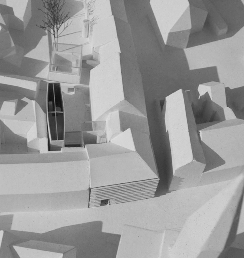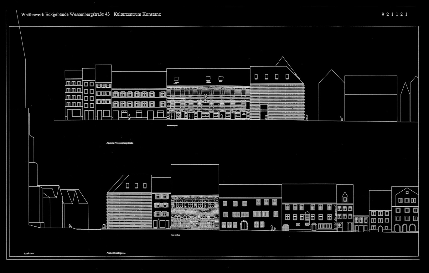 das wettbewerbsgebiet wird durch das münster und seine historische umgebung geprägt. das kulturzentrum, das mit seinen verschiedenen institutionen in diese bebauung integriert wird, erstreckt sich über mehrere gebäude hinweg entlang der so genannten wessenbergstraße und der katzgasse. durch die Schließung des Quartiers, den Neubau an der ecke, erhalten die kulturinstitutionen ihr eigentliches zentrum mit gemeinsamem eingang neben den bestehenden eingängen. die hofbebauung - turmhaus katzgasse 1 - und turmhaus katzgasse 5 - werden durch ein weiteres körperhaftes element ergänzt. mit dem eckgebäude wird versucht die traditionellen städtebaulichen und körperlichen gesetzmäßigkeiten zu zerlegen und diese neu zusammenzufügen. als konstruktion wird eine dem bücherregal verwandte stapelartige rahmenkonstruktion gewählt, welche die eckaussteifung aufnimmt, als auch den bestehenden fresken bestand gewährt. die fassade besteht aus drei teilen, aus der äußeren, horizontale gegliederten glasfassade, die die rein schützende und schließende funktion des gebäudes übernimmt (haut); aus einem eingestellten winkel als element der lochfassade und aus dem konkret definierten eingang. das dach folgt den firstlinien der umgebenden bebauung.