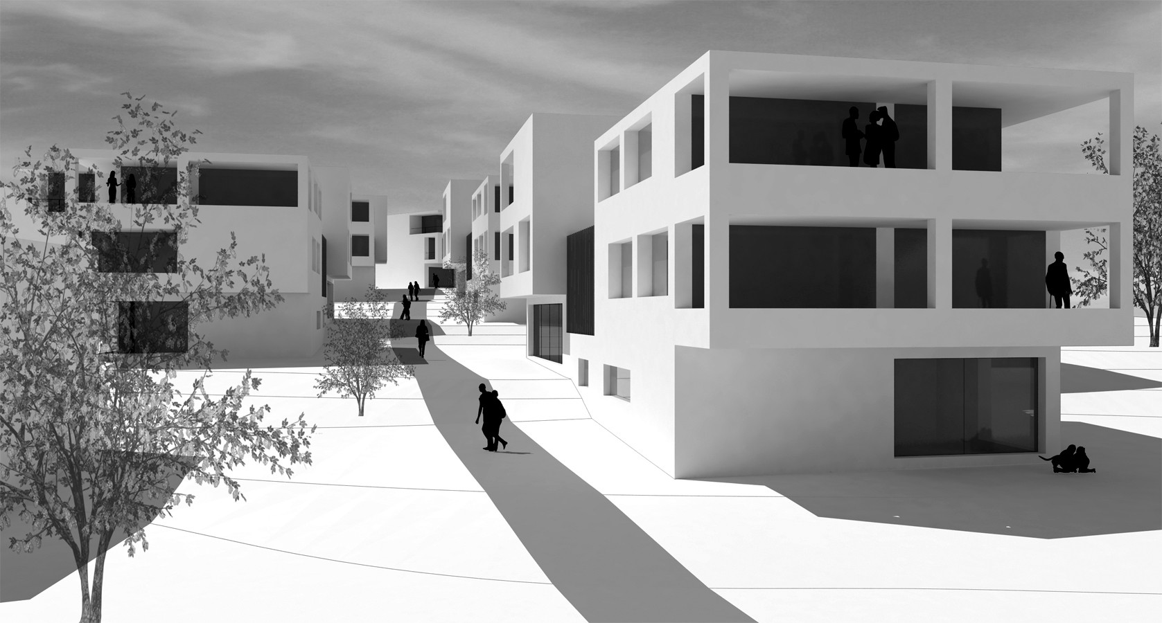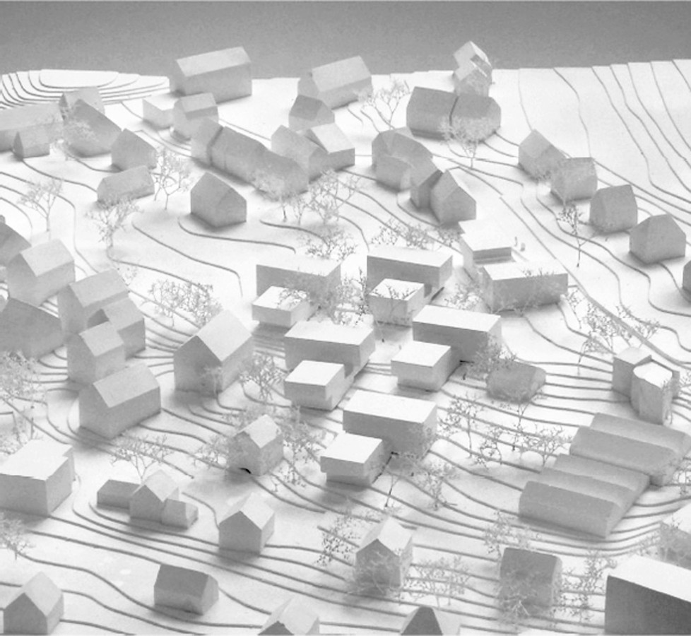 Ziel ist es,dieTopographie des Geländes wieder sichtbar zumachen. In den Wiesenhang werden die Baukörper integriert. Entsprechend der Hangneigung werden Streuobstbestände eingefügt. Durch Bündelung der Höhenlinien entstehen geneigte Hangterrassen,die bis an die Gebäude hin fließen. Das integrierende Thema der Wohnanlage ist der Wiesenhang, der auch den Charakter bestimmt. Lediglich ein Erschließungsweg windet sich zwischen den Häusern durch, um die fußläufige Erschließung so reduziert als möglich zuhalten. Zugunsten der Gesamtwirkung wird auf den Einschnitt von freiräumlich flächigen Gemeinschaftsanlagen verzichtet, Wertgelegt wird auf einen durchgängigen Grünraum und einen ökologisch/naturhaft reduzierten Charakter der Anlage.
